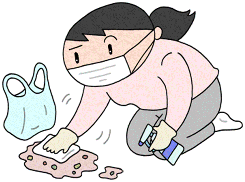 ウイルスの飛まつが舞っている可能性がある、トイレの掃除や、おう吐物の処理の際には必ずマスクを。